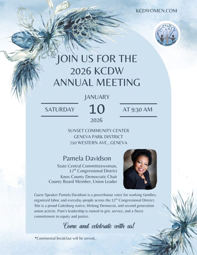 Join us for the 2026 KCDW Annual Meeting this Saturday, January 10th, at the Sunset Community Center, Geneva Park District, 710 Western Avenue, Geneva, IL, from 9:30 am to 11:00 am. Members present will take a vote on the November and December minutes and financials, followed by an election of officers for a two-year term. Chair Carolyn Bird Salazar provides an overview of the year ahead prior to introducing our guest speaker Pamela Davidson, State Central Committeewoman, 17th Congressional District. A continental breakfast will be served. The public is invited to attend and members are encouraged to bring a friend.