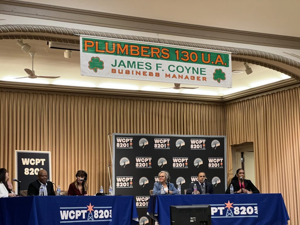 Have you seen the commercials for the Democratic candidates who are running for Dick Durbin’s seat in Congress? Sometimes it’s difficult to look beyond the commercials and choose the best candidate. To make a better choice, five of our members took the train to Chicago on Friday, February 6, to attend the Senate debate hosted by the progressive radio station, WCPT 820 AM. Talk show hosts Richard Chew, Joan Esposito, and Patti Vasquez were the moderators who questioned three of the leading candidates: Lt. Gov. Juliana Straton, Representative Robin Kelly, and Representative Raja Krishnamoorthi.